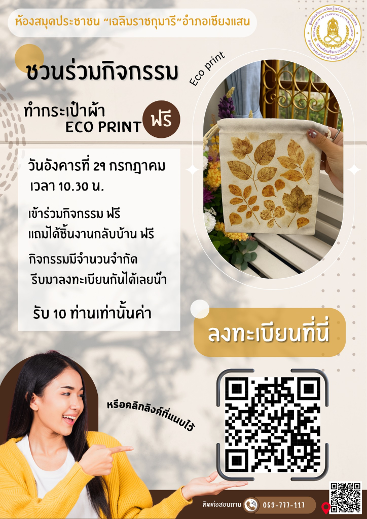 เชิญช่วนประชาชนทุกท่านเข้าร่วมกิจกรรม ทำกระเป่าผ้า eco print ในวันที่ 29 กรกฎาคม 2568 เวลา 10.30 น. เป็นต้นไป ณ ห้องสมุดประชาชน “เฉลิมราชกุมารี”อำเภอเชียงแสน สนใจเข้าร่วม รีบลงทะเบียนตั้งแต่วันนี้ รับจำนวนจำกัด 10 ท่านเท่านั้น กิจกรรมฟรีไม่มีค่าใช้จ่าย