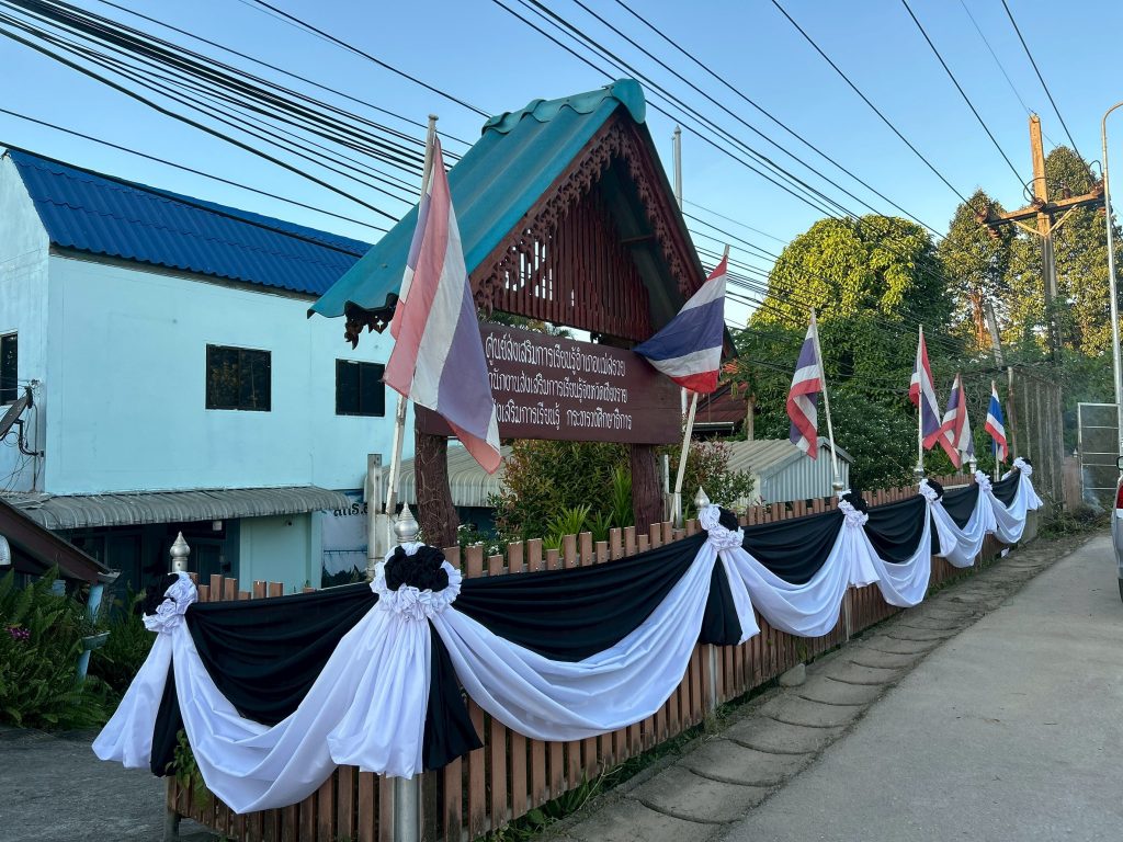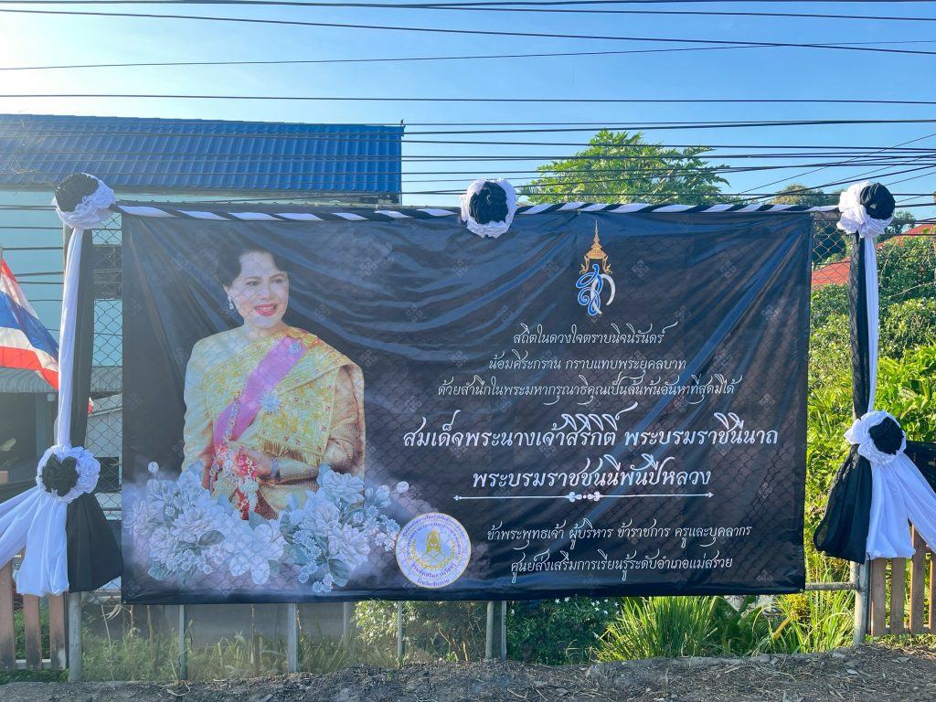 ศูนย์ส่งเสริมการเรียนรู้ระดับอำเภอแม่สรวย ดำเนินการตกแต่งอาคารสถานที่ ด้วยผ้าดำ ขาว, ลดธงครึ่งเสา เป็นเวลา 30 วัน ผู้บริหาร, ข้าราชการ ครู และบุคลากรไว้ทุกข์ เป็นเวลา 1 ปี, จัดโต๊ะหมู่บูชาประดิษฐ์พระฉายาลักษณ์สมเด็จพระนางเจ้าสิริกิติ์ พระบรมราชินีนาถ พระบรม ราชชนนีพันปีหลวง พร้อมประดับเครื่องทองน้อย และโต๊ะลงนามแสดงความไว้อาลัย และจัดนิทรรศการเผยแพร่พระราชประวัติและเทิดพระเกียรติ รวมถึงสอนประดิษฐ์ริบบิ้นไว้อาลัย และแจกริบบิ้นเพื่อแสดงความไว้อาลัยให้กับประชาชนและนักศึกษา