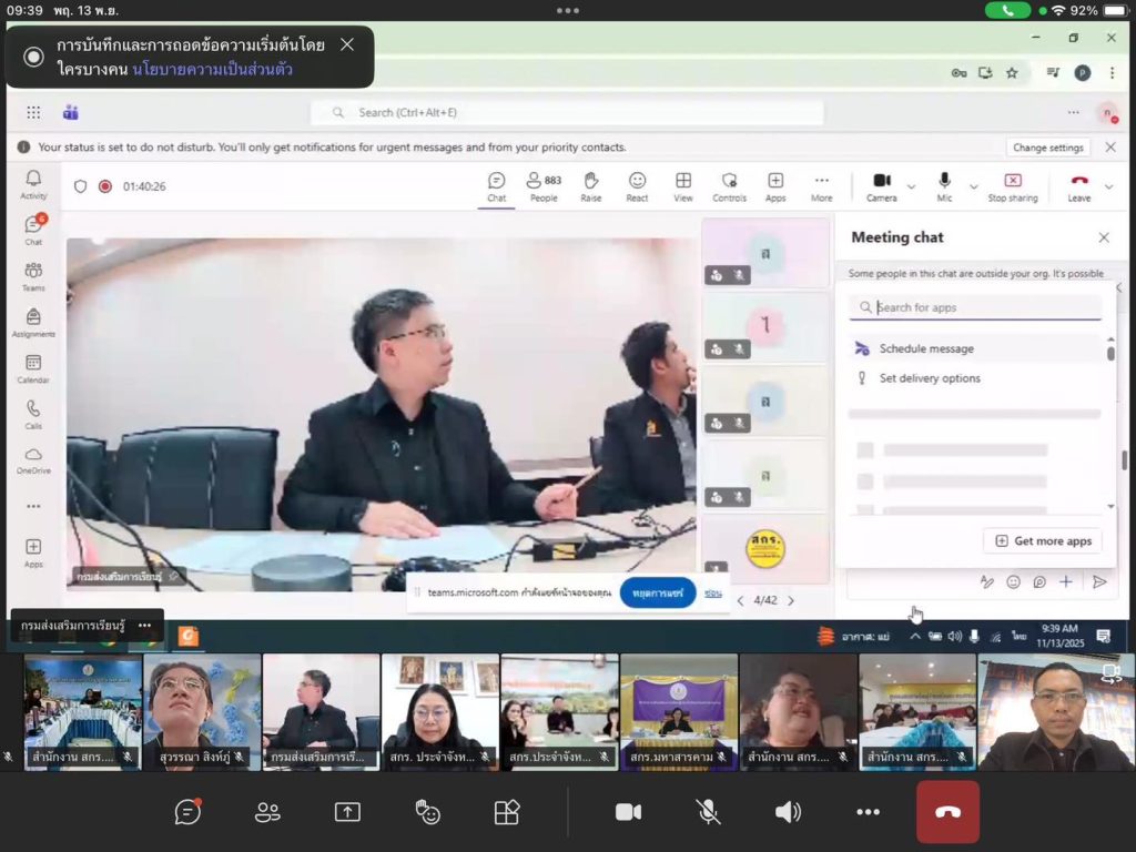วันที่ 13 พฤศจิกายน พ.ศ. 2568 นายศิริศักดิ์ อานี ผู้อำนวยการศูนย์ส่งเสริมการเรียนรู้ระดับอำเภอป่าแดด จังหวัดเชียงราย เข้าร่วมประชุมรับฟังการชี้แจงการสำรวจข้อมูลเกี่ยวกับงบประมาณเงินอุดหนุนรายหัวการจัดการการศึกษาขั้นพื้นฐานของกรมส่งเสริมการเรียนรู้ในรูปแบบออนไลน์ผ่านโปรแกรม Microsoft Teams โดยท่านรองอธิบดี ท่านยุพิน บัวคอม เป็นประธานในการประชุมครั้งนี้ โดยมีวัตถุประสงค์เพื่อชี้แจงรายละเอียดการสำรวจข้อมูลเกี่ยวกับงบประมาณเงินอุดหนุนรายหัวการจัดการศึกษาขั้นพื้นฐานของกรมส่งเสริมการเรียนรู้ ให้กับหน่วยงานในสังกัดกรมส่งเสริมการเรียนรู้ทุกแห่ง ให้มีความเข้าใจถูกต้องและปฏิบัติไปในทิศทางเดียวกัน